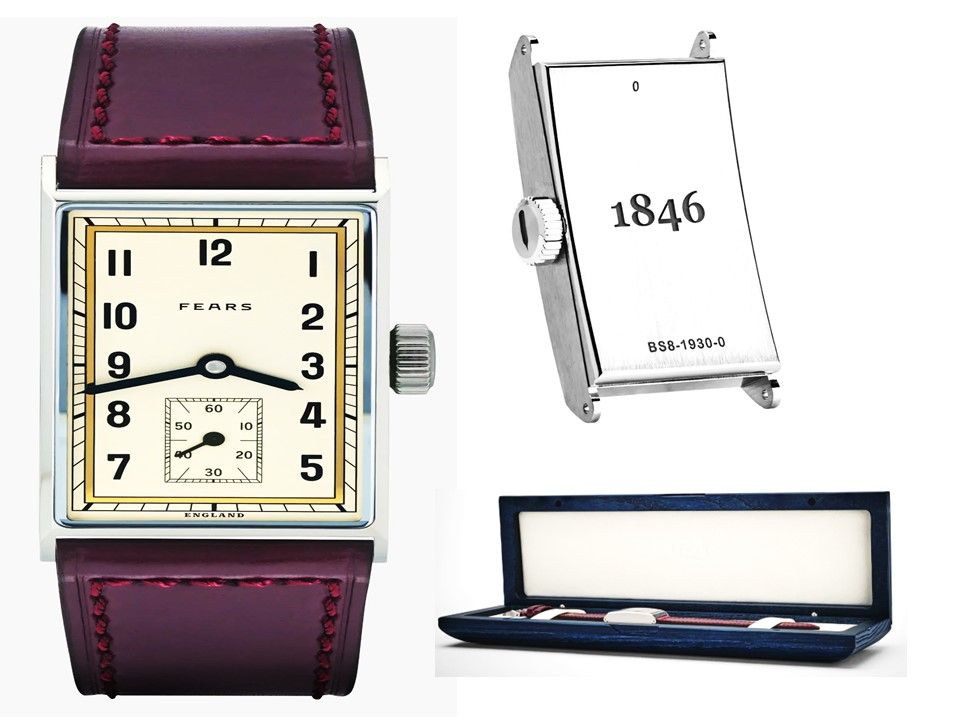 Le boîtier fin et rectangulaire reprend les proportions élégantes du modèle original de 1930.Le boîtier est usiné en acier inoxydable 316L. Boitier avec une finition combinant brossage linéaire et polissage miroir. Grâce à son profil incurvé, cette montre longue et fine épouse parfaitement le poignet. La base du cadran est d'abord polie puis plaquée or jaune 18 carats. Les aiguilles massives en forme de « Fears » présentent un biseau central sur toute leur longueur. Ce biseau leur permet de capter magnifiquement la lumière. Le bracelet, en cuir de veau est confectionné à la main dans un coloris rouge bordeaux traditionnel.